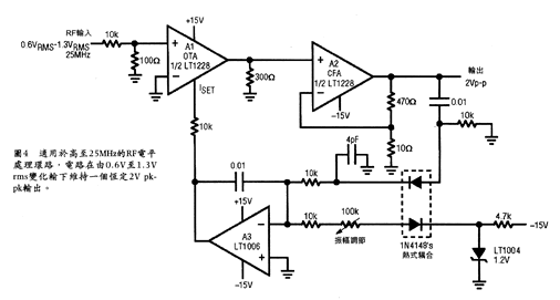 图4所示的基本自动电平控制电路,提供效能至10MHZ时可有20dB增益控制,加设一个输出驱动、半波整流器及增益控制缓冲器,即成为一个低成本的RF电平控制级,这个简单电路,特点是漂移低、失真低。可操作高至25MHZ,在以0.6V至1.3Vrms输入下,它产生恒定的2V pk-pk输出。至于更高的频率,还有不少专门的可变增益放大器,有两个引起我的注意是TL026(注3)及CLC520R(注4),提供有大的AGC范围、阔频宽及低相移,以及加上有容易控制的增益。